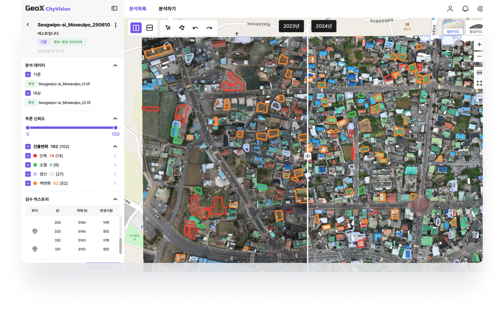 CityVisionX는 국토와 도시의 건물, 도로, 지형의 변화탐지 기능을 제공하여, 스마트시티 구현을 위한 최신성이 확보된 데이터 기반 미래를 예측을 지원하는 최적화 플랫폼입니다.