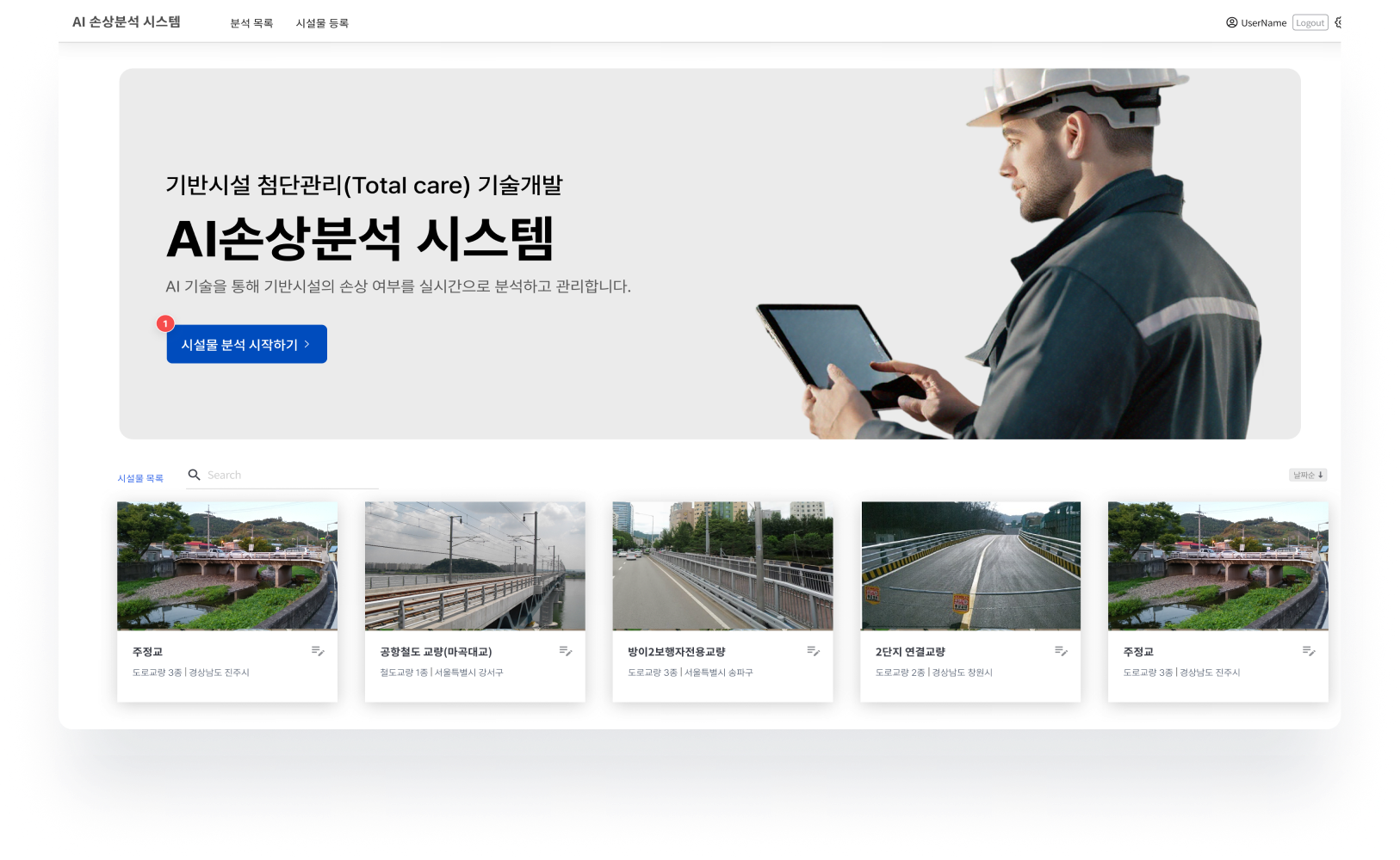 CrackEyeX는 AI 기반의 미세 균열 탐지 기술을 통해 교량, 터널, 도로, 건축물 등 도시 기반 시설물의 이상 징후를 정밀 진단하고, 유지보수를 효율화하는 스마트 유지관리 솔루션입니다.